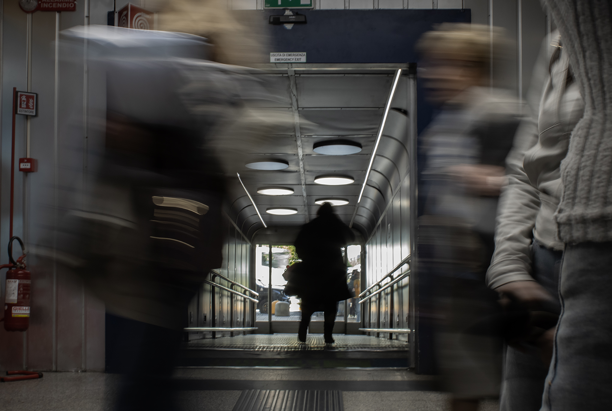 - L'immagine racconta il continuo fluire della vita urbana, dove le persone si muovono rapide e sfocate. Il tunnel illuminato conduce verso l'esterno, simbolo di una meta da raggiungere o di un nuovo inizio. Il contrasto tra la figura centrale, nitida e solitaria, e le ombre struggenti ai lati crea un senso di isolamento nel caos aeroportuale, evocando il ritmo incessante della quotidianità.