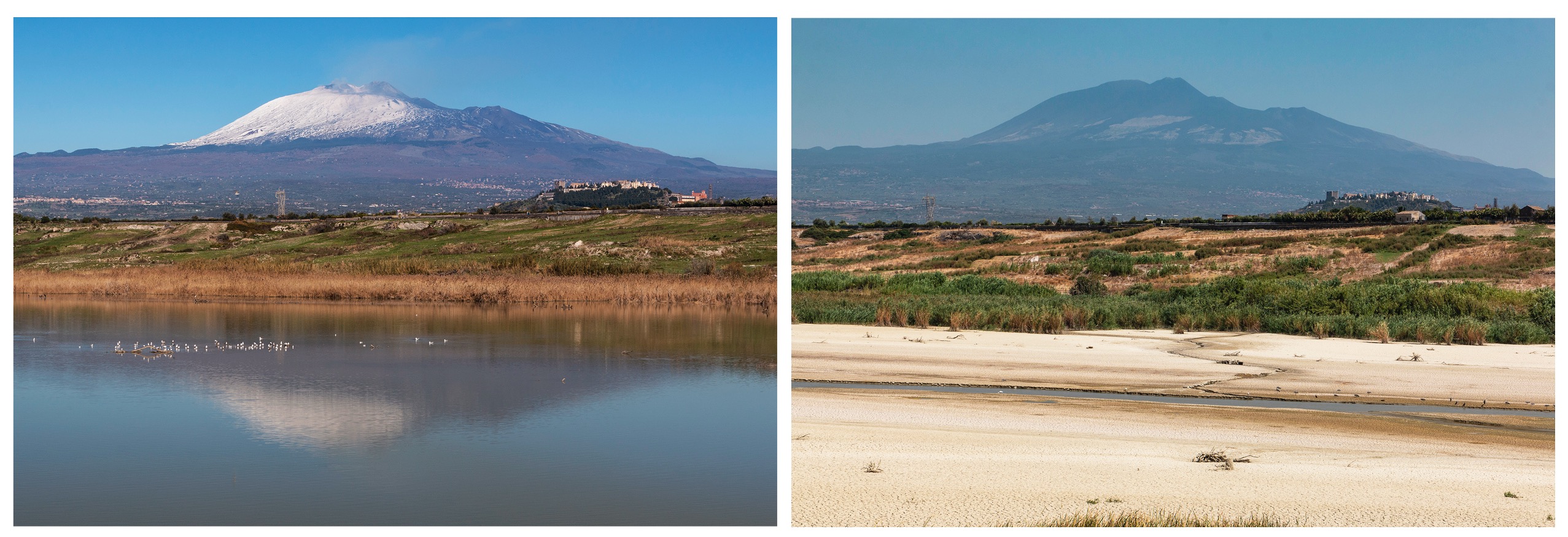 - La foto mette in risalto due scatti fatti in due diversi periodi dell’anno, la prima scattata in inverno in cui la maggior presenza di acqua nel Simeto è una risorsa che fa prosperare la flora e la fauna della riserva “Oasi Ponte Barca”, la seconda foto scattata nel periodo estivo lo stesso fiume si trasforma in un piccolissimo torrente che a stento riesce a far sopravvivere una piccolissima parte dell’ecosistema che lo popola.