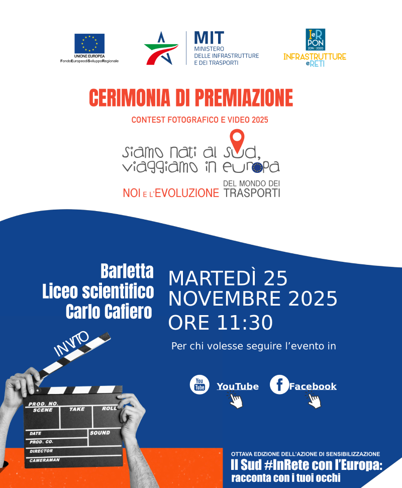 Il prossimo martedì 25 novembre si svolgerà la manifestazione di premiazione dei concorsi 2025, promossi nell'ambito della campagna di sensibilizzazione "Il Sud #InRete con l'Europa: racconta con i tuoi occhi". L'attività di sensibilizzazione rende i cittadini consapevoli degli interventi realizzati dal PON-IR nelle regioni del sud e mira a stimolare una riflessione sulle ricadute del Programma e sui cambiamenti del territorio.